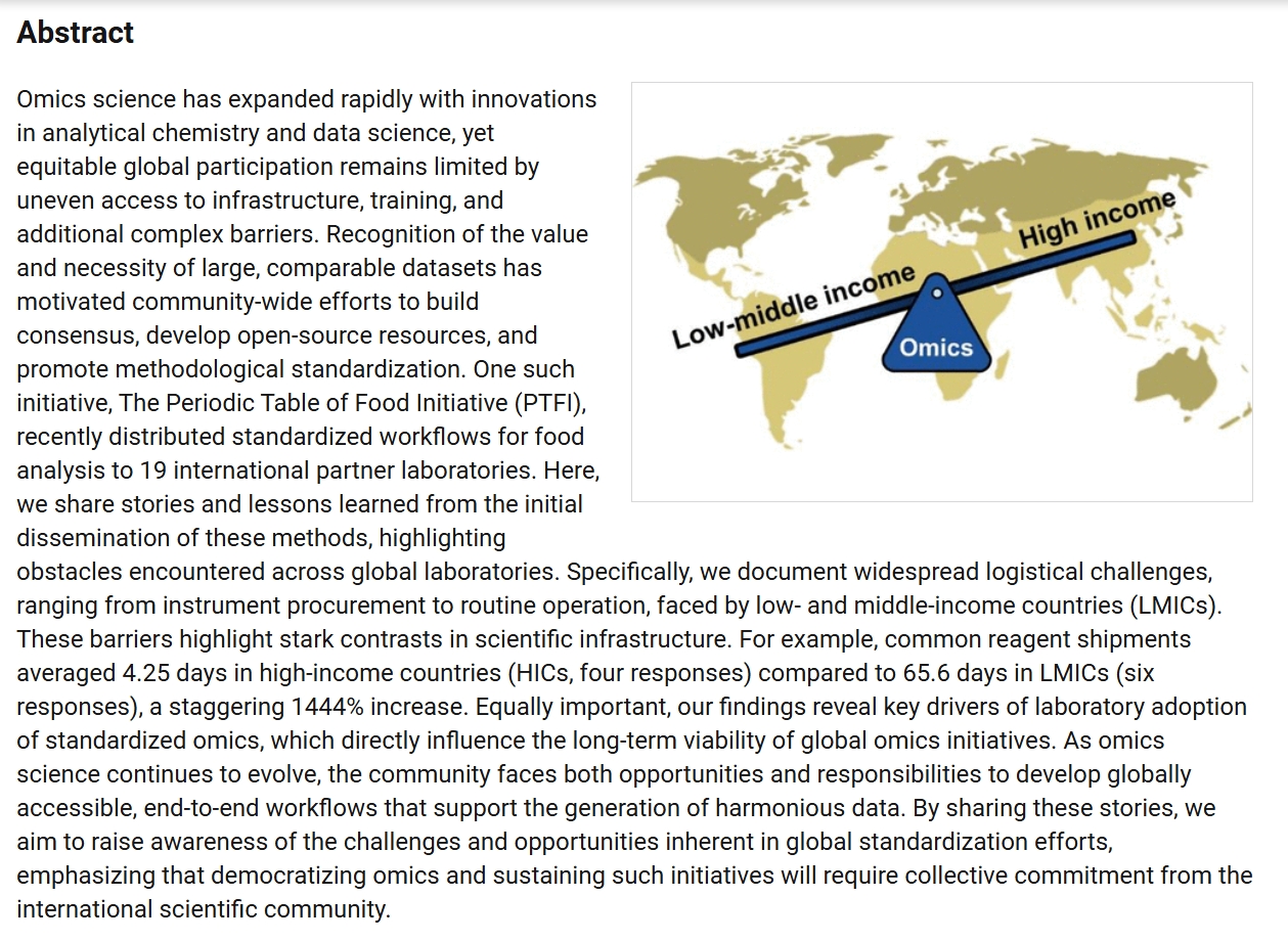 Odenkirk, M.T.; Michel C.; Doenges, K.A.; Leaptrot, K.L.; Sherrod, S.D.; May, J.C.; Read, M.L.; Chaparro, J.M.; Montgomery, N.; Brinkley, S.; Vaniya, A.; Mitchell, S.M. ; Yu, B.; Elhaderi, J.K.; Henson, L.; Broeckling C.D.; Feihn, O.; Reisdorph, R.; Reisdorph, N.; McLean J. A.; Chein, C.; Shafizadeh, T.; de la Parra, J.; Ahmed, S.; Watkins, S.; Prenni, J.E. A standardized nontargeted metabolomics method for cross-laboratory comparison of food profiles, Food Chemistry, Volume 493, Part 3, 2025,145934, ISSN 0308-8146, https://doi.org/10.1016/j.foodchem.2025.145934.